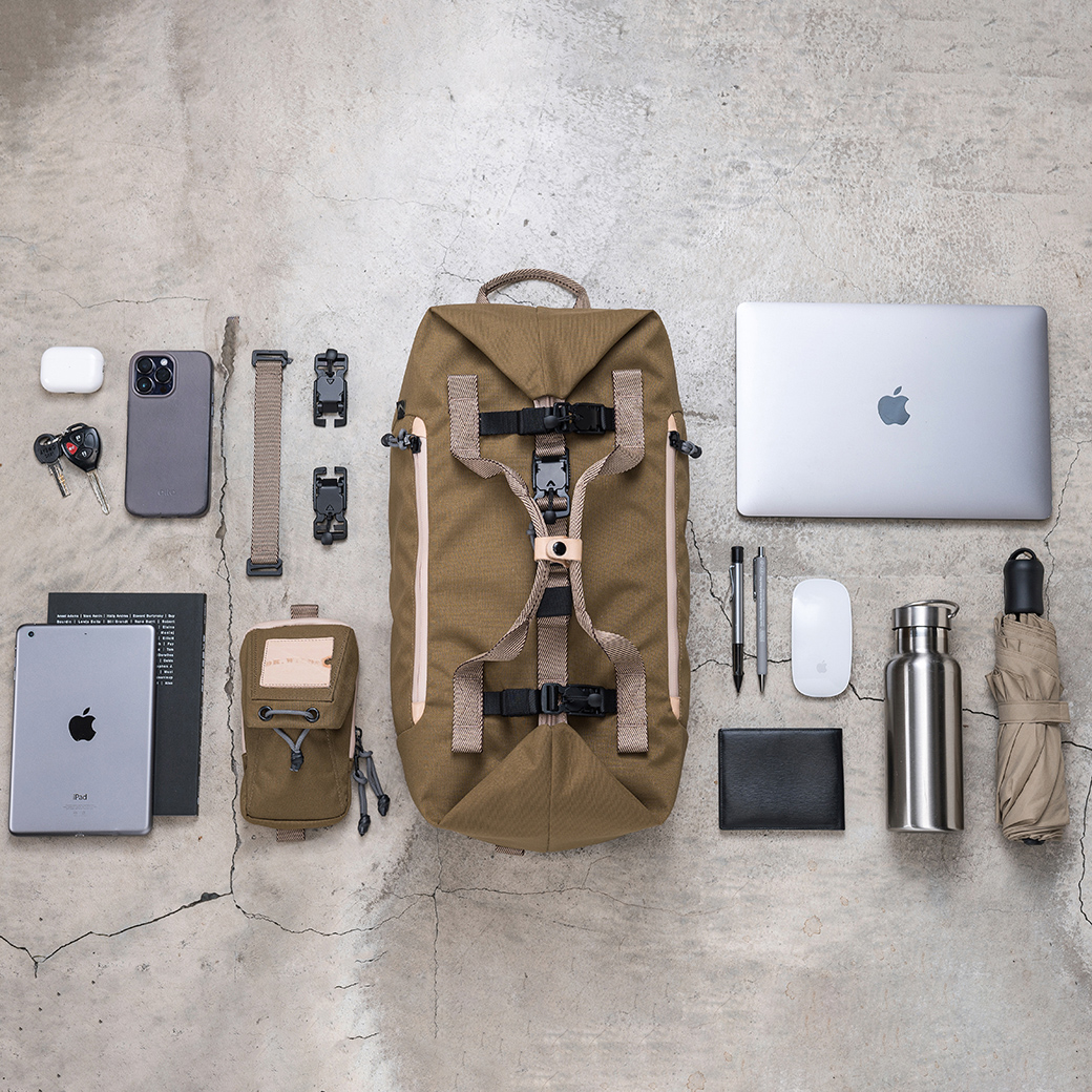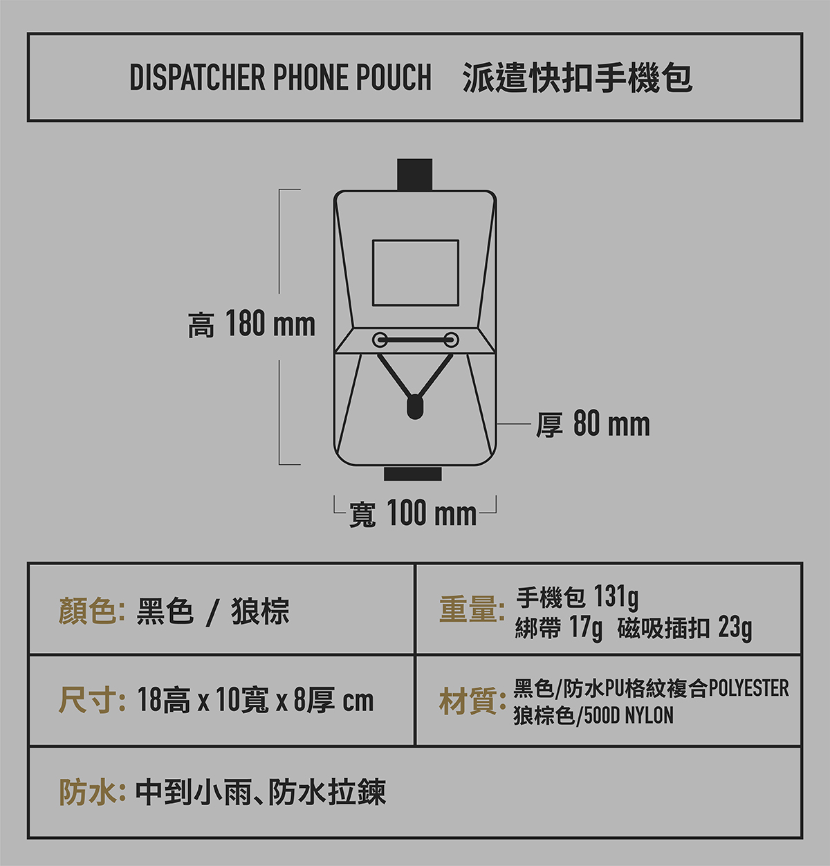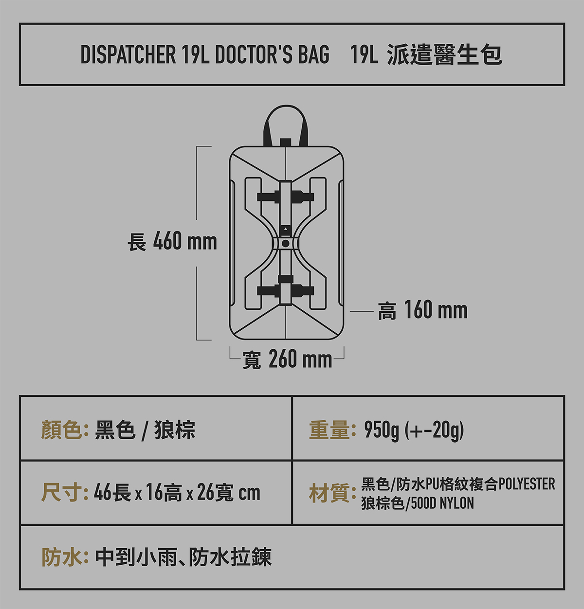- 主料(黑色/防水PU格紋複合Polyester、狼棕色/500D NYLON)