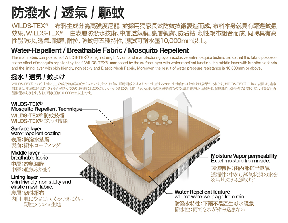 💬貼心提醒 *為避免影響防水及防蚊效果,請勿使用熱水及化學溶劑清洗。 *布料建議採用陰乾方式自然風乾,長時間太陽曝曬可能導致防水、防蚊、色牢度下降。