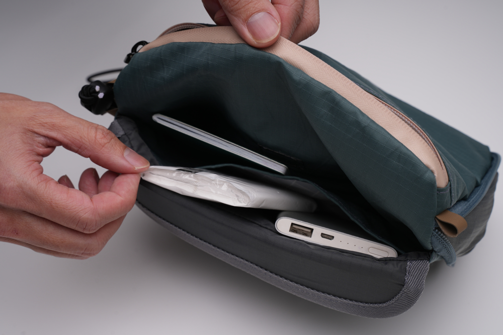 能容納較厚的物品。背面快取口袋可方便臨時取物,不論是在行進間吊掛胸前或者斜背使用,