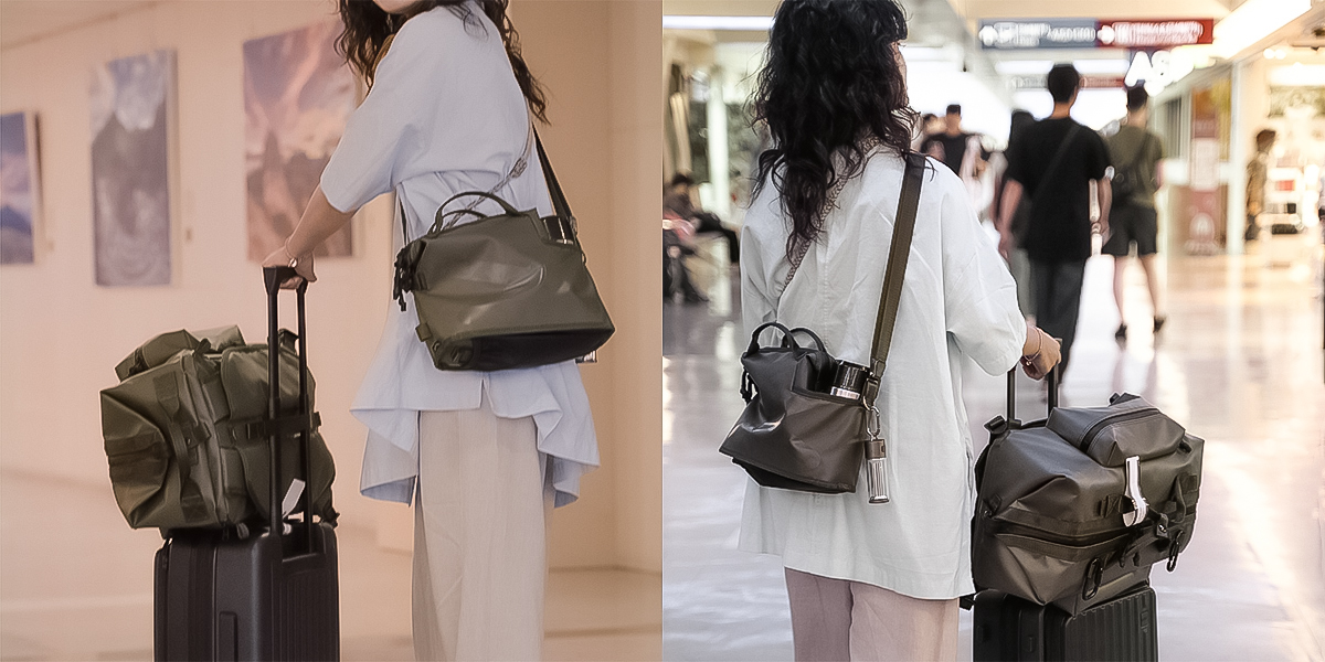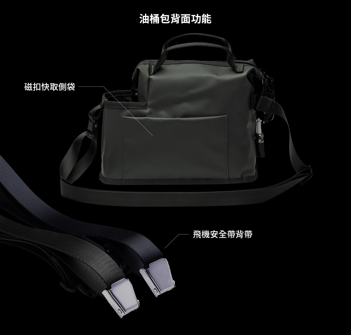 油桶包採用了兩款經典配色 —『軍綠色』與『黑色』,可以輕鬆搭配任何服裝風格展現穿搭亮點。兩種顏色均採用霧面消光處理,能有效避免日常使用中的刮痕與磨損,確保包包在各種環境下都能保持最佳狀態。