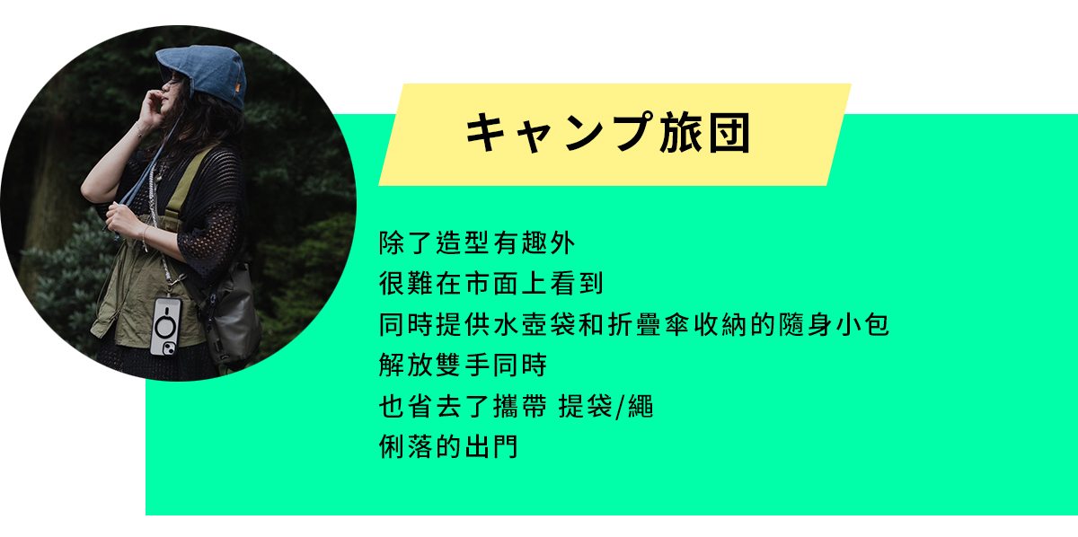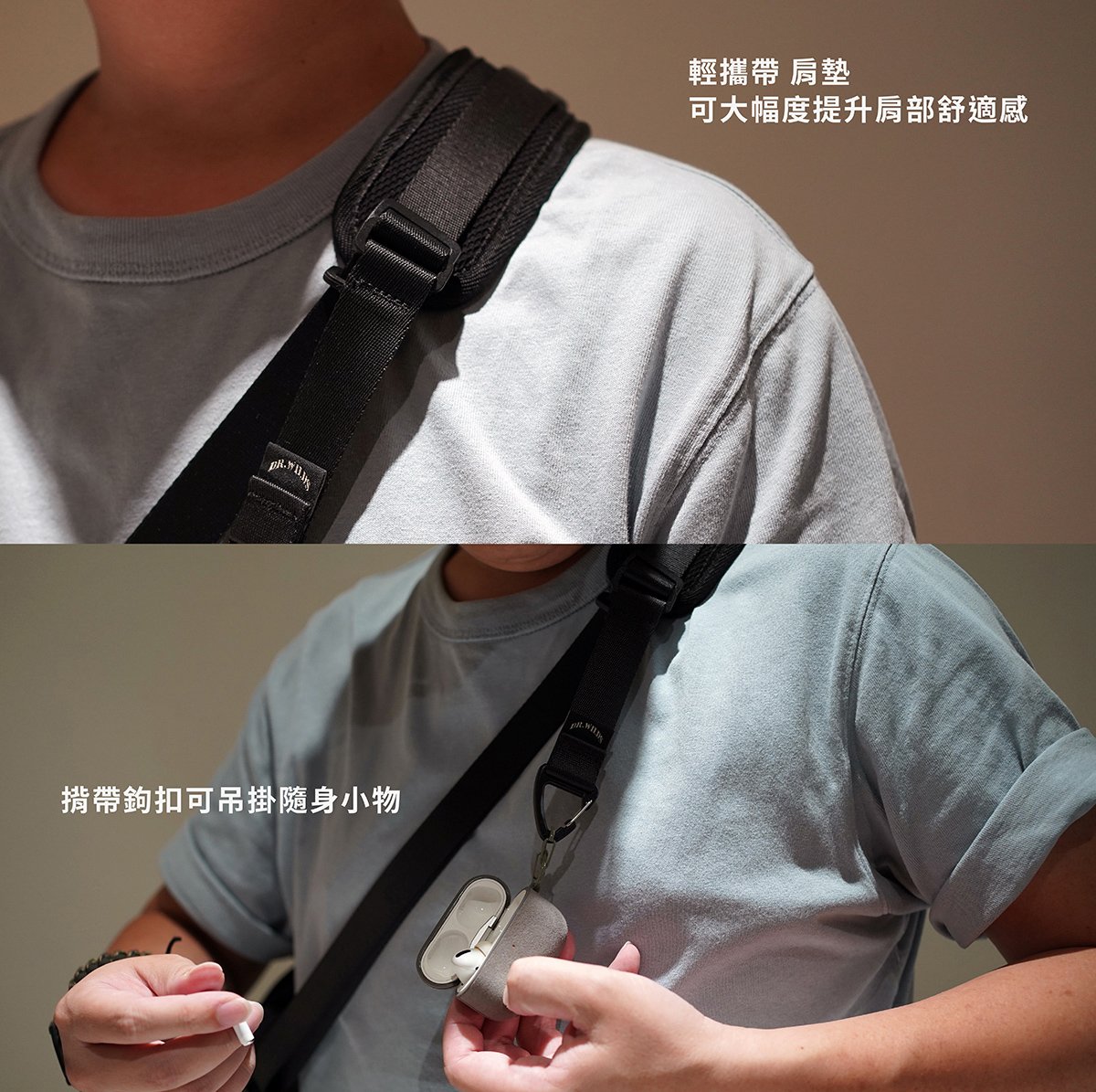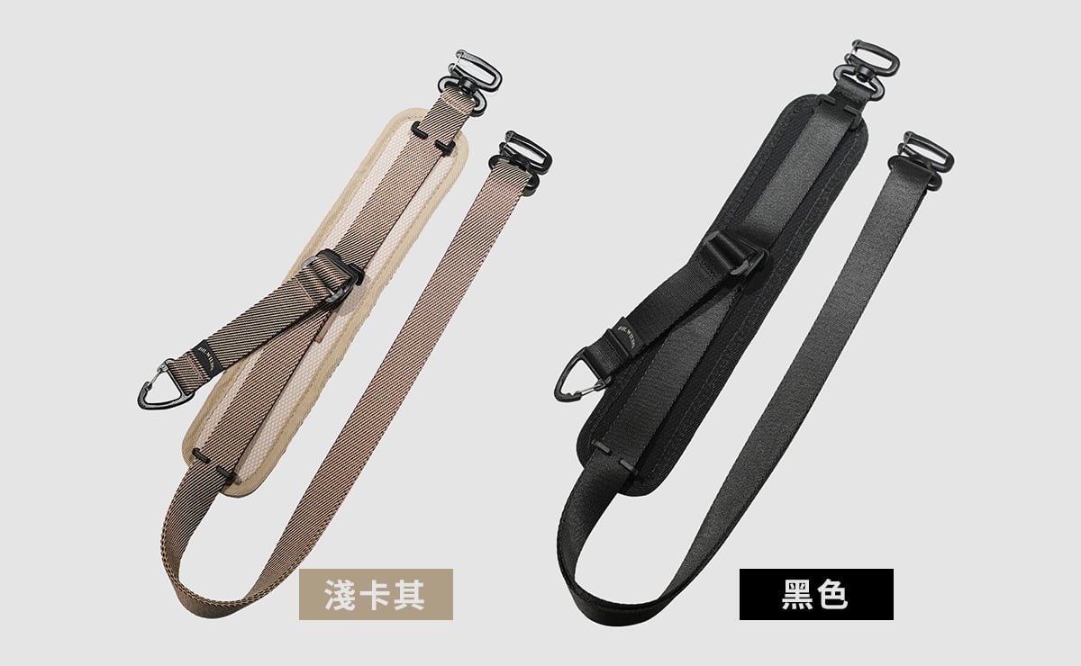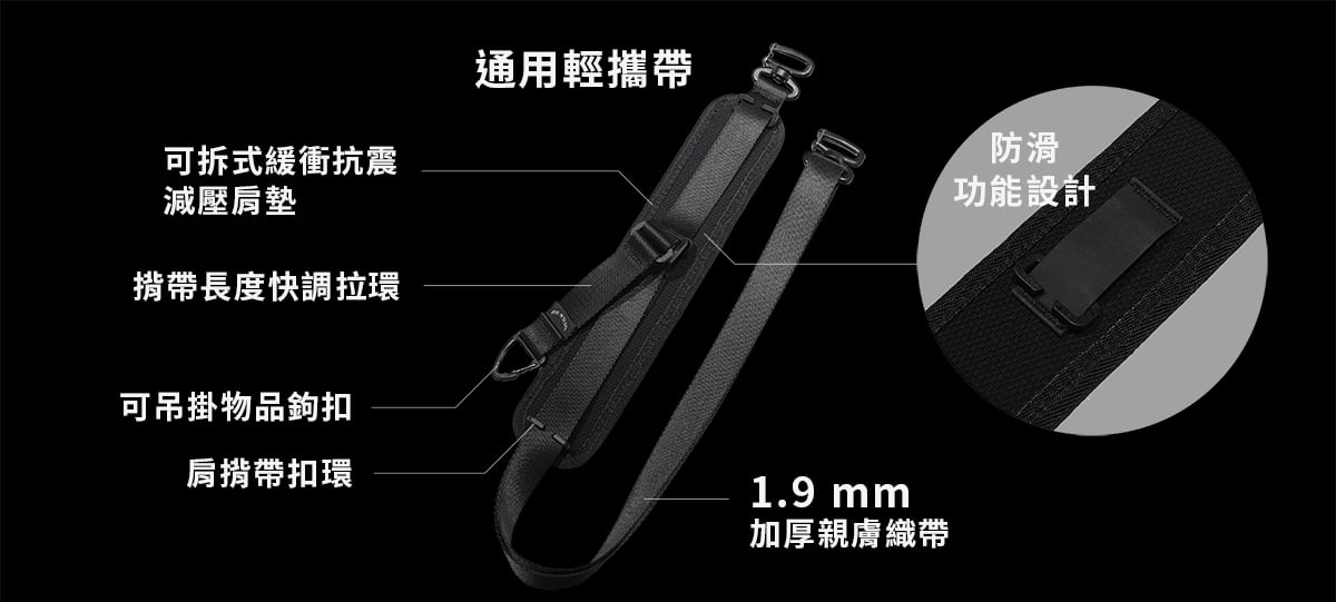 「輕攜帶」是系列產品中的通用揹帶,帶來肩部減壓的效果;揹帶採用加厚的1.9MM親膚織帶,比起一般的揹帶更加厚實;可拆式肩墊設計,具有防滑和提升舒適度的效果,能在揹較重的物品時,或者騎車時需要穩定包包的功能。