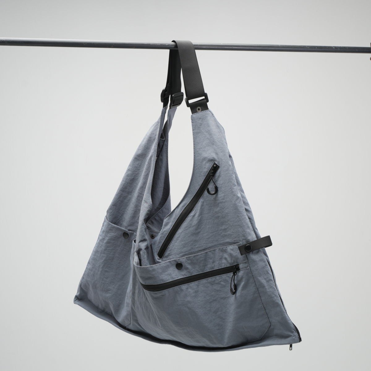 單肩斜背示範:透過雙邊拉鍊,背心即可改變為單肩包使用。